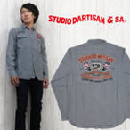 シャンブレー素材を使用したボディにマチ、ガチャポケなどヴィンテージのワークシャツに見られる細部のデザイン。パッチや刺繍で飾られたデザインはスタジオダルチザンらしく賑やかな印象。左右非対称なワークポケットや、やや褪せた色合いでどんどん使っていくうちに表情の変化を楽しめるデニムワークシャツになっています。