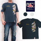 粋狂から、抜染Tシャツの登場です。 素材はコットン100%のしっかりとした良質な生地を使用。 さらにコダワリとして、「抜染」と呼ばれるプリント方法。 通常のペンキプリントやインクプリントだと、 プリント部分の通気性が低下し、着心地が悪くなるのですが、 このプリント方法だと、汗をかいてもサラっと快適に着続けられます。 両面に入ったプリントデザインは存在感があり とてもインパクトのあるデザインなので目立つこと間違いなしですよ♪ *こちらのTシャツはウォッシュがかけられており、時に色ムラのような跡がございますがそういった風合いのためご了承下さいませ。