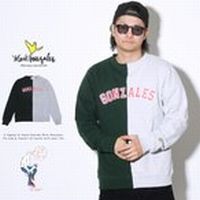 世界で最も有名なプロスケーターでありながら詩人、画家、音楽PCの監督など、アーティストとしても著名なゴンズの愛称で知られるスケート界のレジェンドMark Gonzales(マーク・ゴンザレス)。 今作は中央でカラーを切り替えたグレー×グリーンのセンターセパレートデザインにアメカジテイスト溢れるカレッジロゴプリントを合わせた、ストリート感溢れる斬新なデザインのトレーナー。 ボディは程良い厚みで肌触りの良い、ミドルウェイトの裏毛スウェット生地を採用。メイントップスとして主役で着るのは勿論、アウターの下のインナーにと、春秋冬の3シーズンで着回せる使い勝手も抜群な一着。 ブランド:Mark Gonzales(マークゴンザレス) メーカー品番:2G7-4320 素材:(本体)綿100% /(リブ)綿95% ポリウレタン5% サイズ:着丈│身幅│肩幅│袖丈(cm) M:66│51│43│65 L:69│54│46│66 XL:72│57│49│67 備考:メンズ ファッション 長袖 トップス…