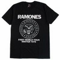 有名バンド、大物ミュージシャン、アメコミ等を中心に様々なジャンルの正式ライセンスを保有し、企画・製作をしている「ROCK OFF」によるオフィシャルTシャツ。 保有ライセンスの多さとデザインに定評があり、お馴染みの定番デザインからレアなデザインまで幅広く取り扱いがあります。 74年結成、NYが産んだパンクロック界のレジェンド、“ラモーンズ/Ramones”のメンズ半袖Tシャツです。 「Presidential Seal」をモチーフにしたお馴染みのデザインで、ラモーンズの1978年のワールドツアーのデザインです。 ヴィンテージタッチのプリントがクールです! ※バンド公認のオフィシャルライセンス商品です。 [S] 身幅(胸囲):約44cm、着丈:約66cm、肩幅:約36cm、袖丈:約20cm [M] 身幅(胸囲):約48cm、着丈:約70cm、肩幅:約41cm、袖丈:約21cm [L] 身幅(胸囲):約54cm、着丈:約73cm、肩幅:約45cm、袖丈:約22cm 80% COTTO…
