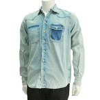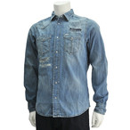 ディーゼル DIESEL D-BROOME ブルーウォッシュ ジーンズの後ろポケット風のデザインを胸元に ハードなリペアダメージを加えたシャンブレー長袖シャツn