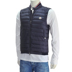 モンクレール Moncler ネイビーブルー スーパースリム 前後コンビ素材 立ち襟 極薄手&軽量ダウンベスト メンズブランド