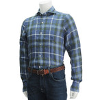 フィナモレ シャツ メンズ Finamore simone シモーネ ブルー&グリーンチェック リネン100% カッタウェイ 長袖 シャツ