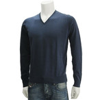スコッチ&ソーダ SCOTCH&SODA ネイビーカラー CHILLワッペンロゴ Vパッチネックのトレーナー風デザイン 起毛違い濃淡のある紺色ウールセーター