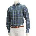 フィナモレ Finamore SERGIO セルジオ ブルー系チェック グリーンMIX 洗いによって淡く仕上がっているリネン100%爽快 麻ホリゾンタルカラー長袖シャツ